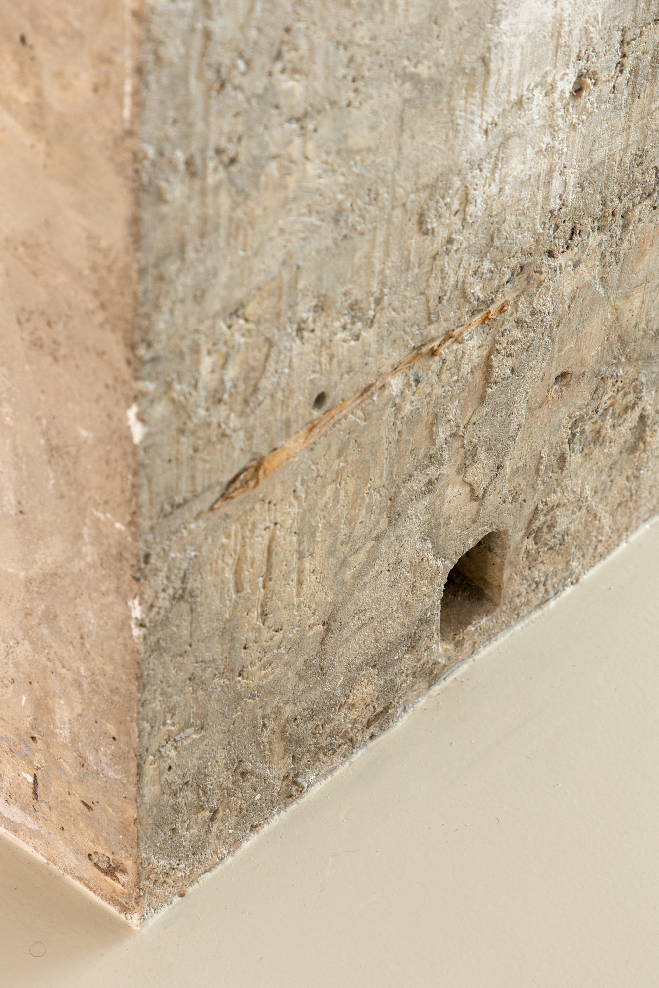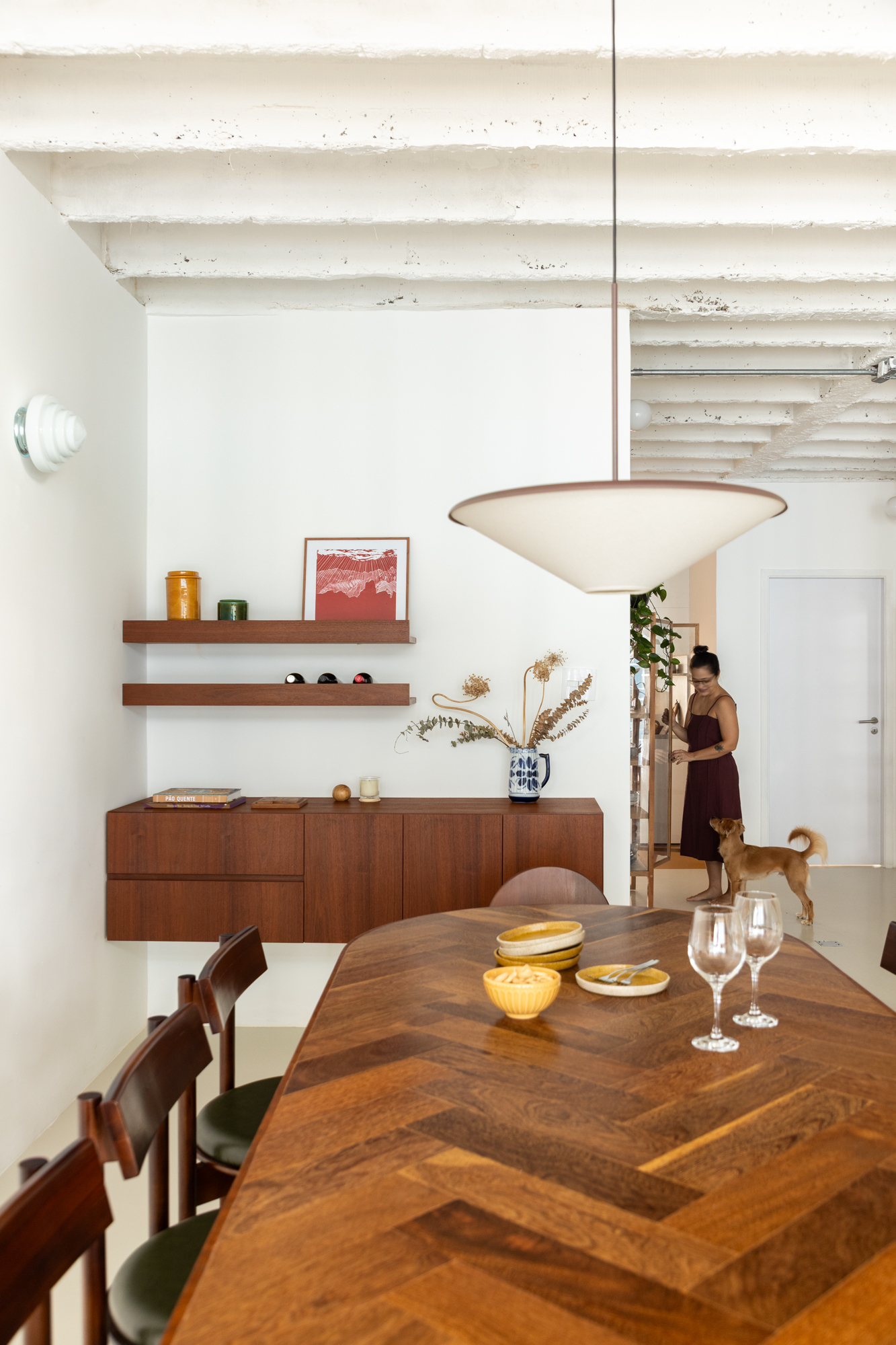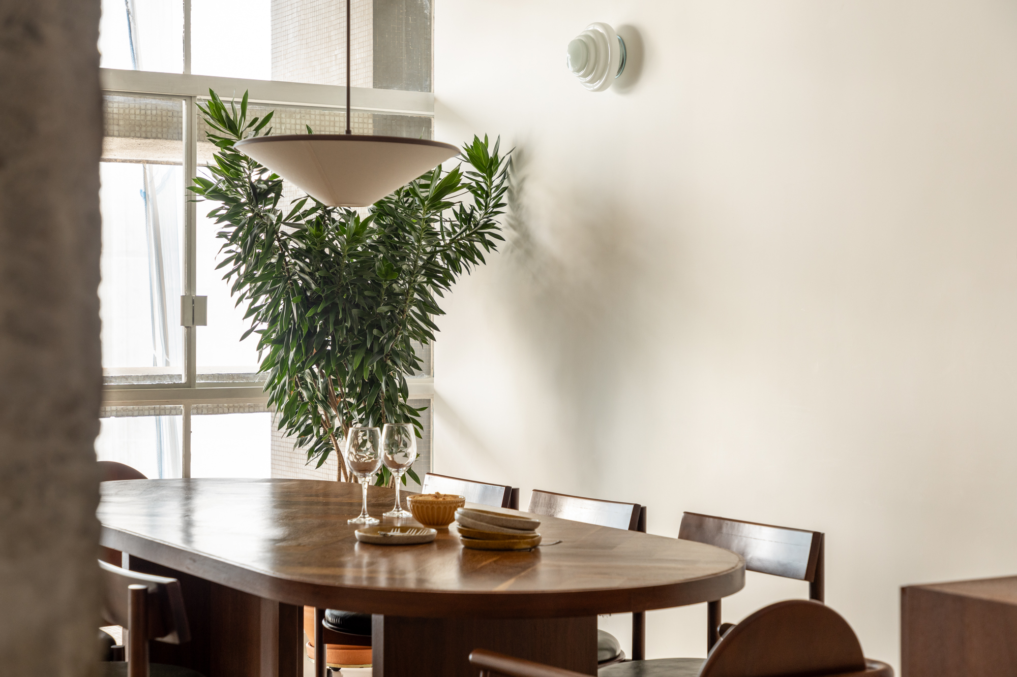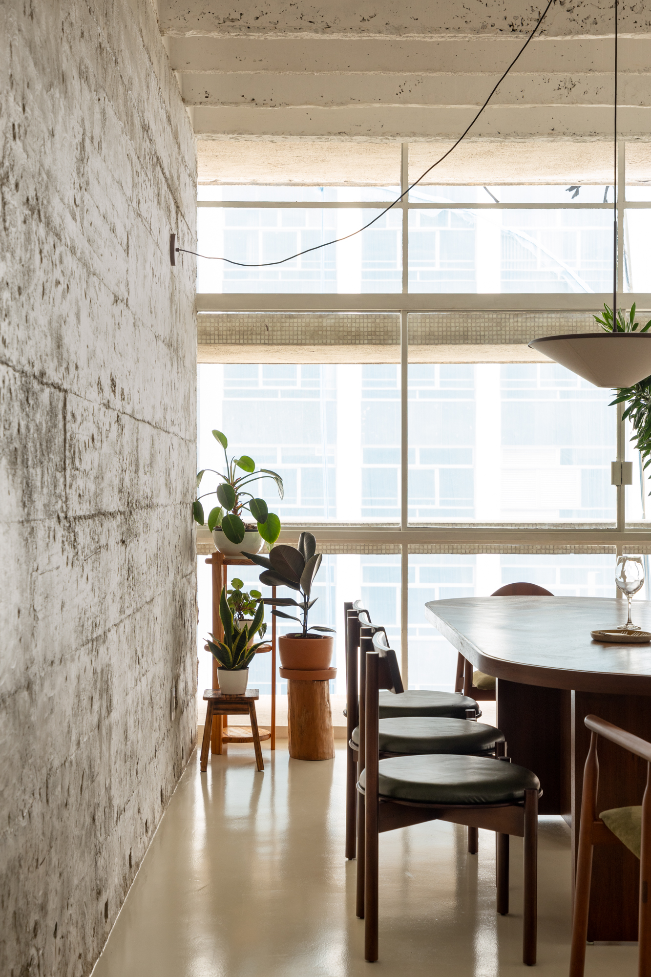 A materialidade se equilibra entre o bruto, carregando a história do edifício, e o minimalismo contemporâneo e tropical, presentes em revestimentos como o piso monolítico em todo o apartamento, demarcando apenas os setores do layout através da sua paleta de cores. O tom off white, especificado para a área social, evidencia a curadoria de mobiliário, incluindo a mesa da sala de jantar – desenhada pelo escritório – feita com o tampo em taco de sucupira.