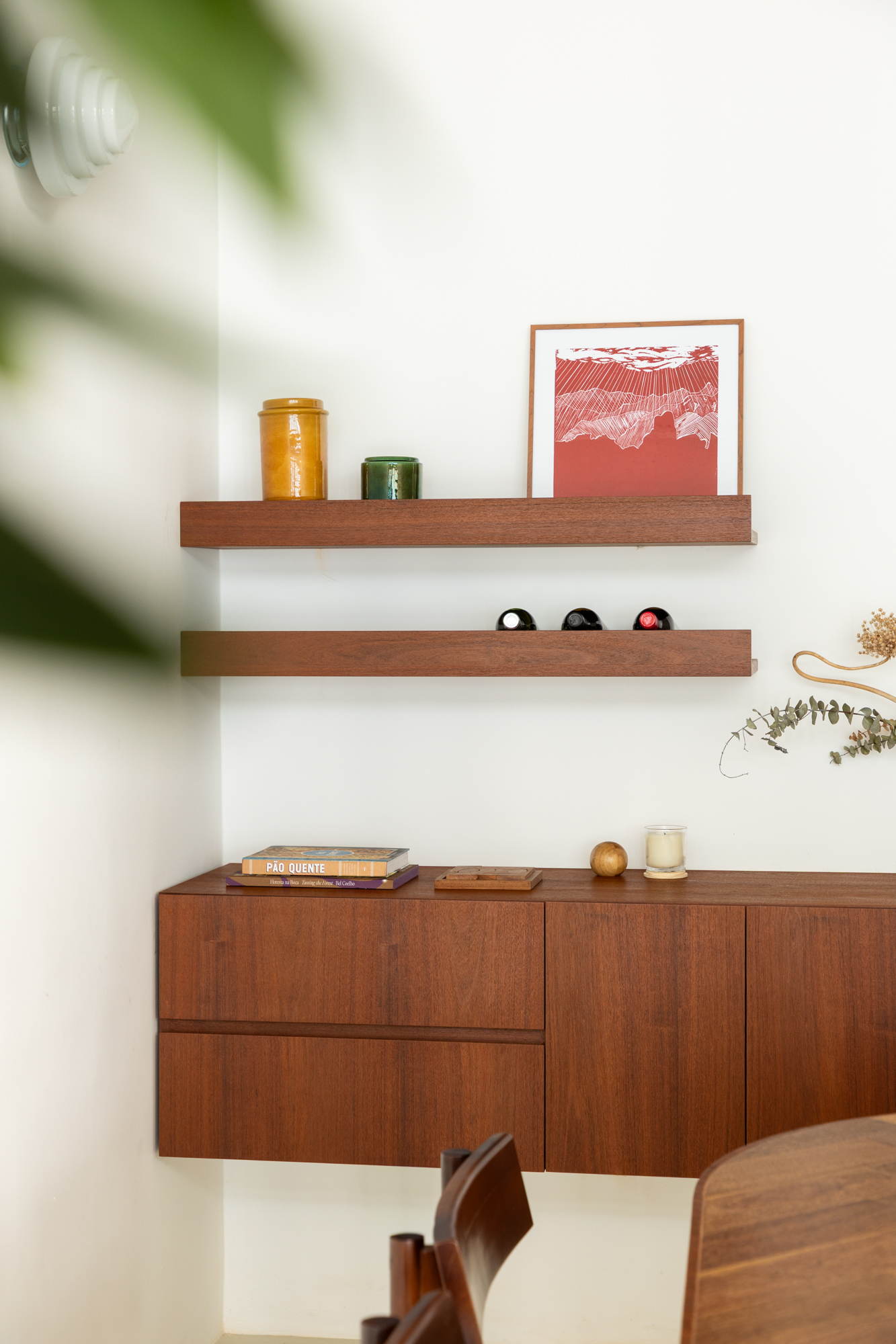 A marcenaria contida, que varia entre folha de Ipê e branco, dá espaço a respiros importantes no raciocínio do projeto, evidenciando planos claros e trazendo leveza ao todo, principalmente onde o contraste com elementos brutos pede sensibilidade.