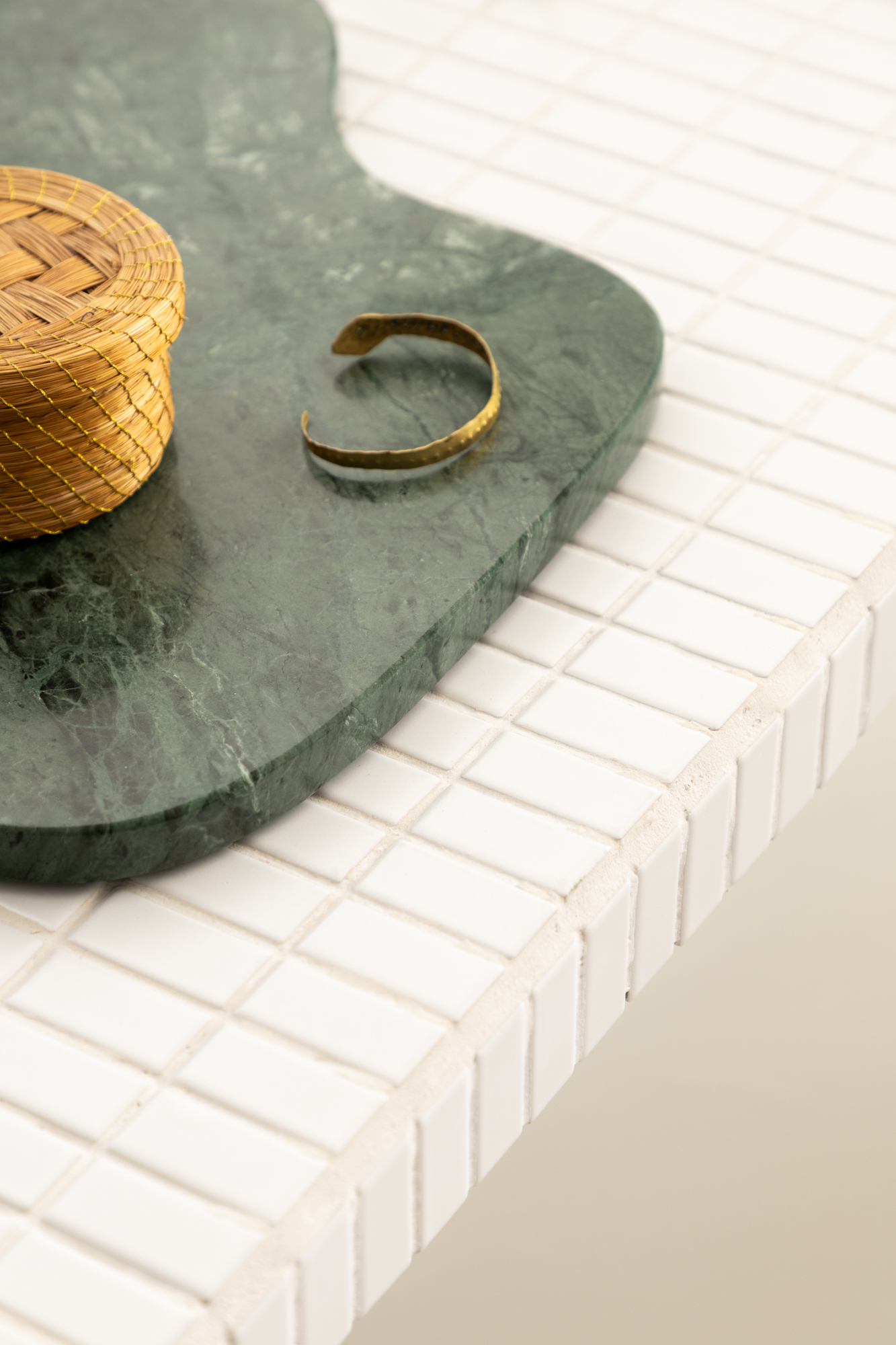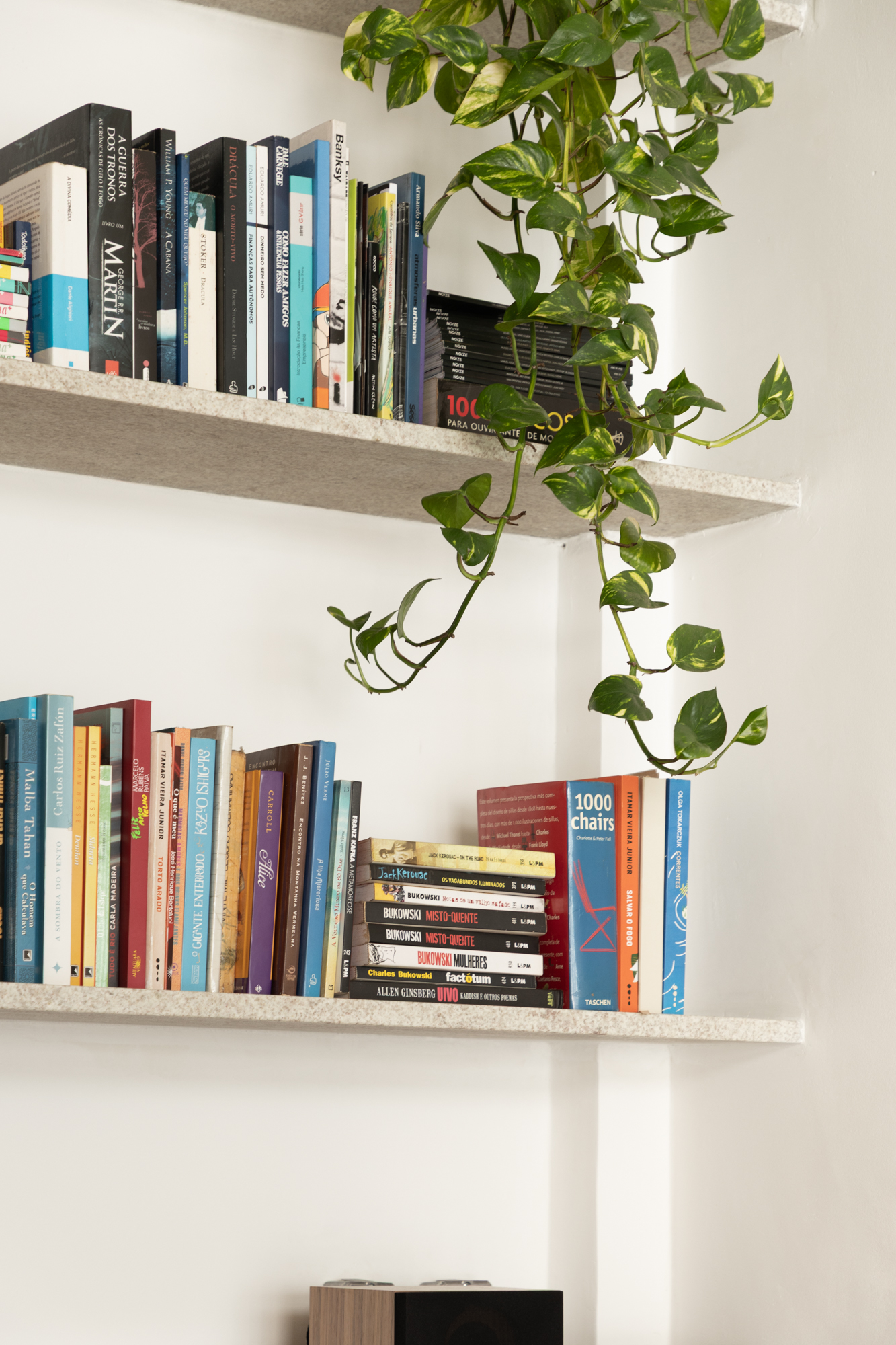 Na área de estar, uma menção aos clássicos brises em concreto aparece no banco revestido de pastilhas, que leva a fachada do edifício até a sala e se apresenta ao longo de todo o ambiente. O pilar que faz a divisão com a sala de estar, elemento que partiu de uma frustração em relação aos planos iniciais de integração dos moradores, se torna parte conceitual relevante no todo do projeto, que, assim como a laje – essa teve até as suas formas retiradas na fase de demolição – que unifica toda área social, tem seu concreto revelado, trazendo o peso antagônico à linguagem leve e etérea majoritária no apartamento.