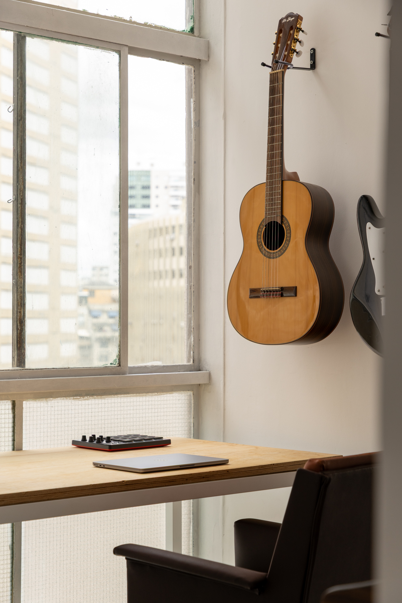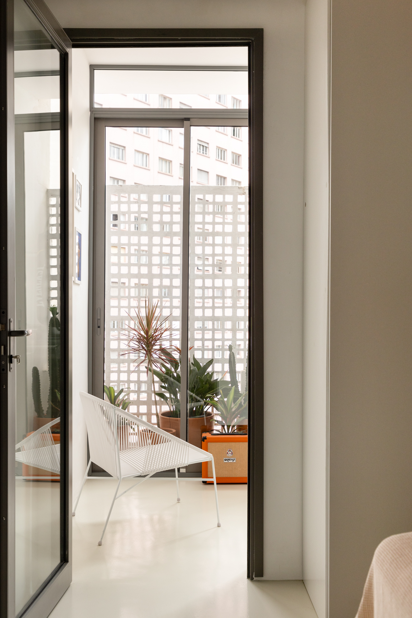 Elemento marcante presente na fachada posterior do Copan, o cobogó foi recuperado a partir da demolição de uma alvenaria construída à sua frente e agora protege tanto a lavanderia quanto o jardim em frente ao escritório – com acesso ao quarto através de uma porta de vidro, que faz com que a luz dos fundos transite suavemente entre cômodos. Os vidros da fachada frontal – a dos brises – também foram resgatados de uma pintura feita tanto interna como externa, a fim de bloquear a passagem de luz, mesmo que já contida pelos elementos horizontais.