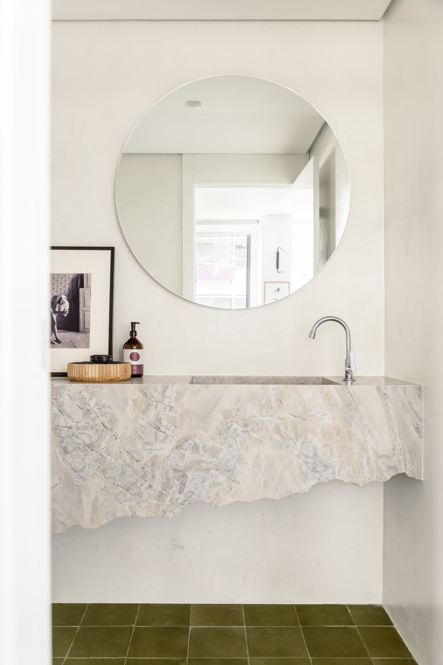 A materialidade parte do ladrilho hidráulico verde, que percorre todo o piso do apartamento e amarra conceitualmente os ambientes. A partir dele, outros materiais se articulam à composição, mantendo uma proposta de acabamentos mais brutos e artesanais, equilibrados por linhas delicadas e elegantes — um contraponto que sustenta um projeto intenso e, ao mesmo tempo, suave.