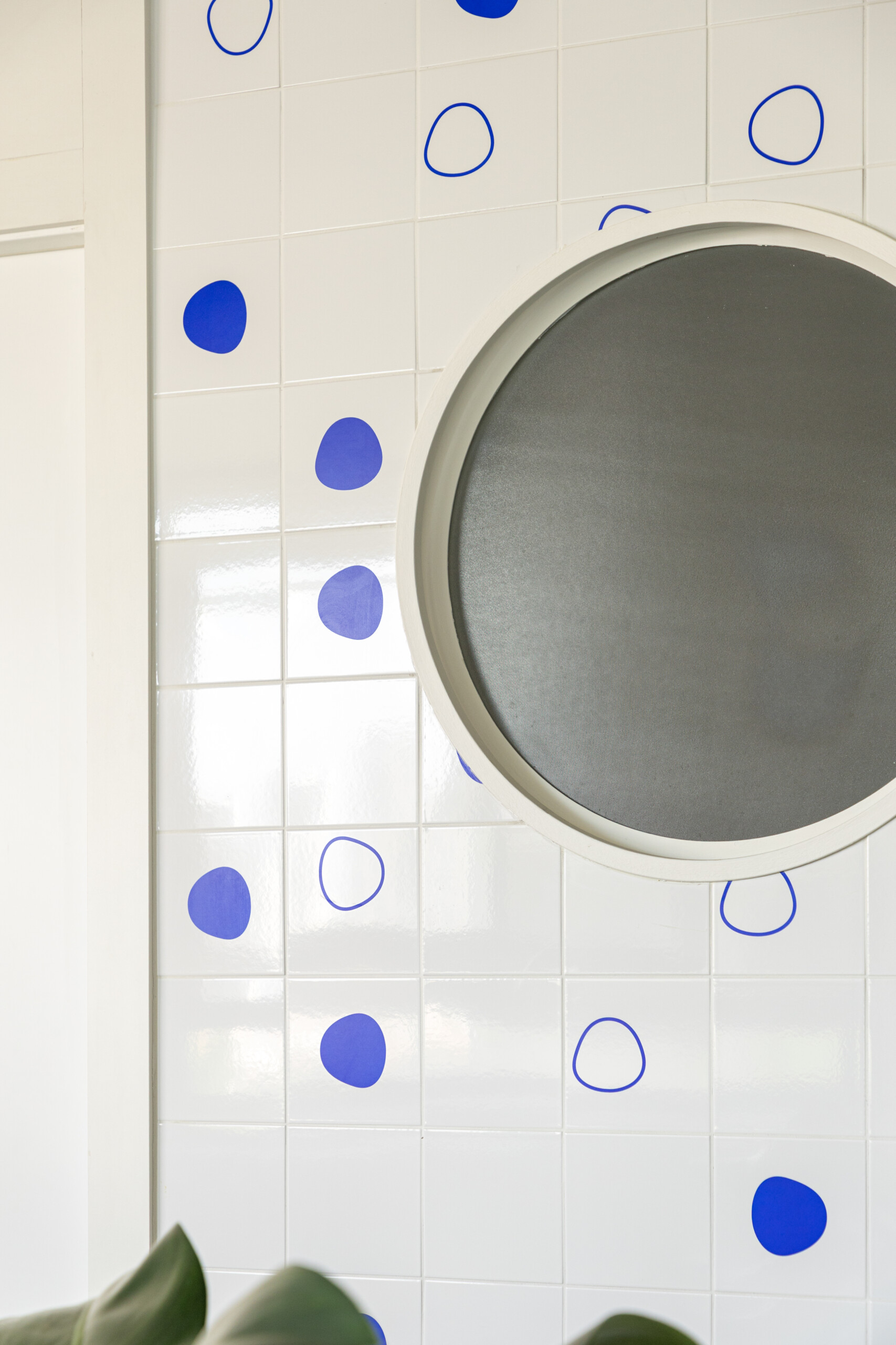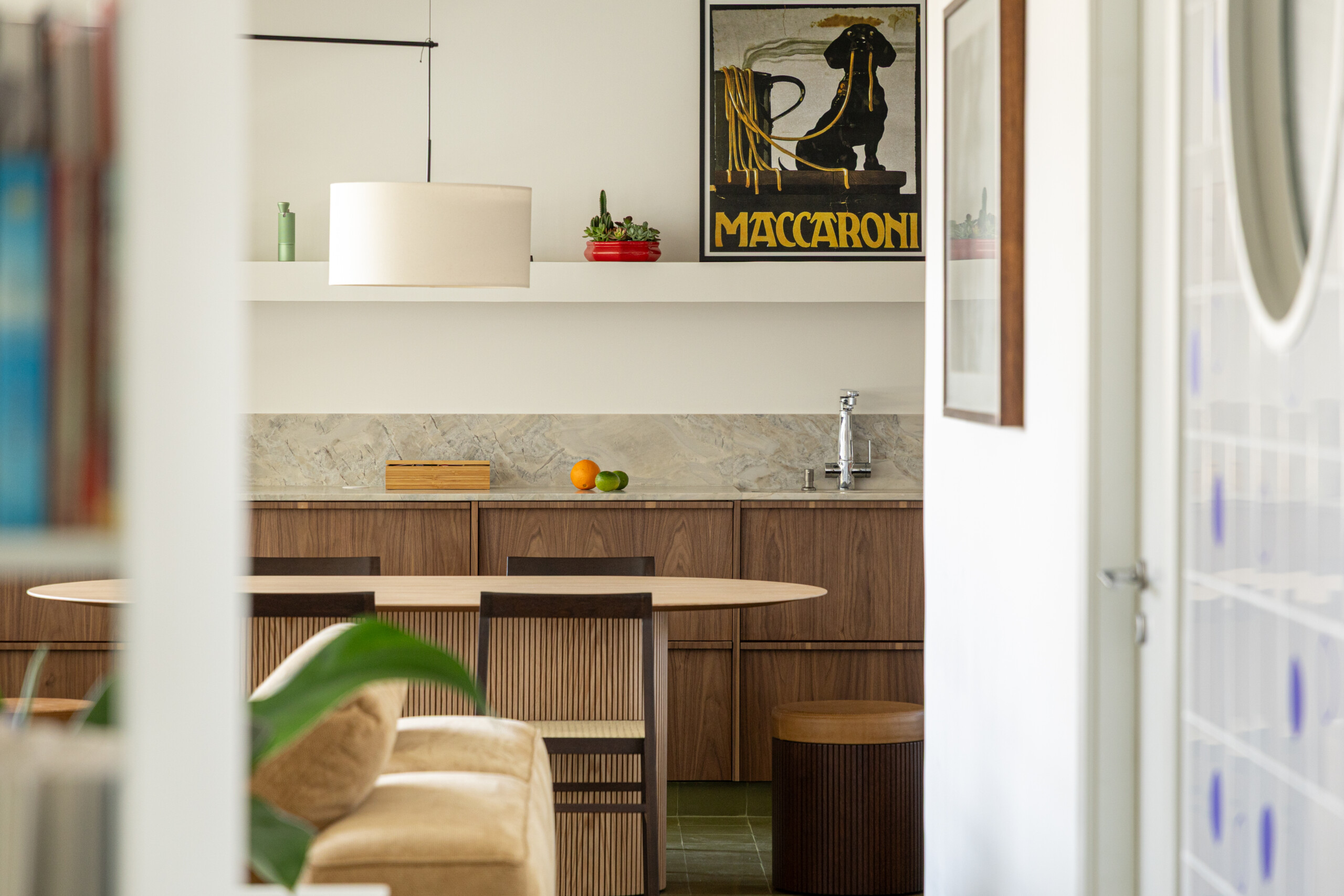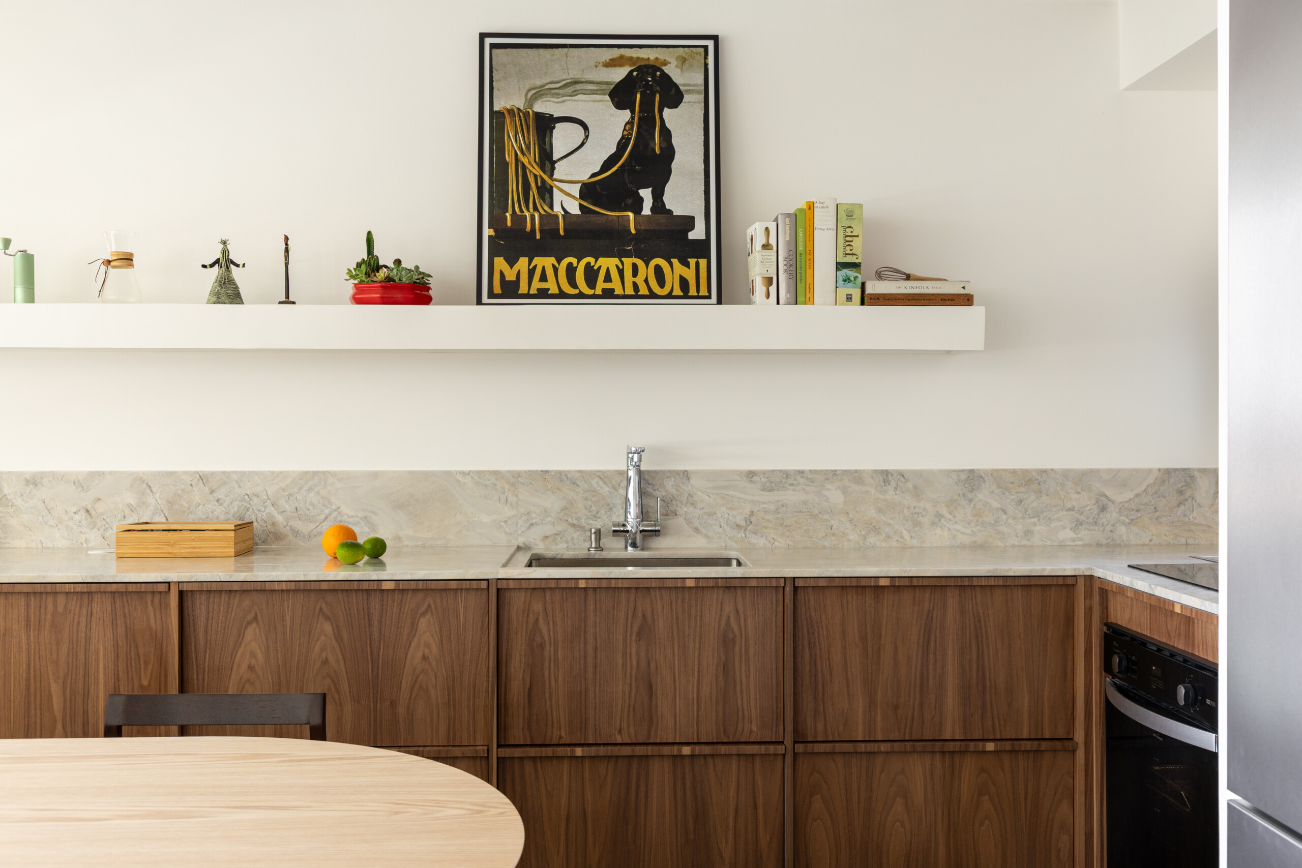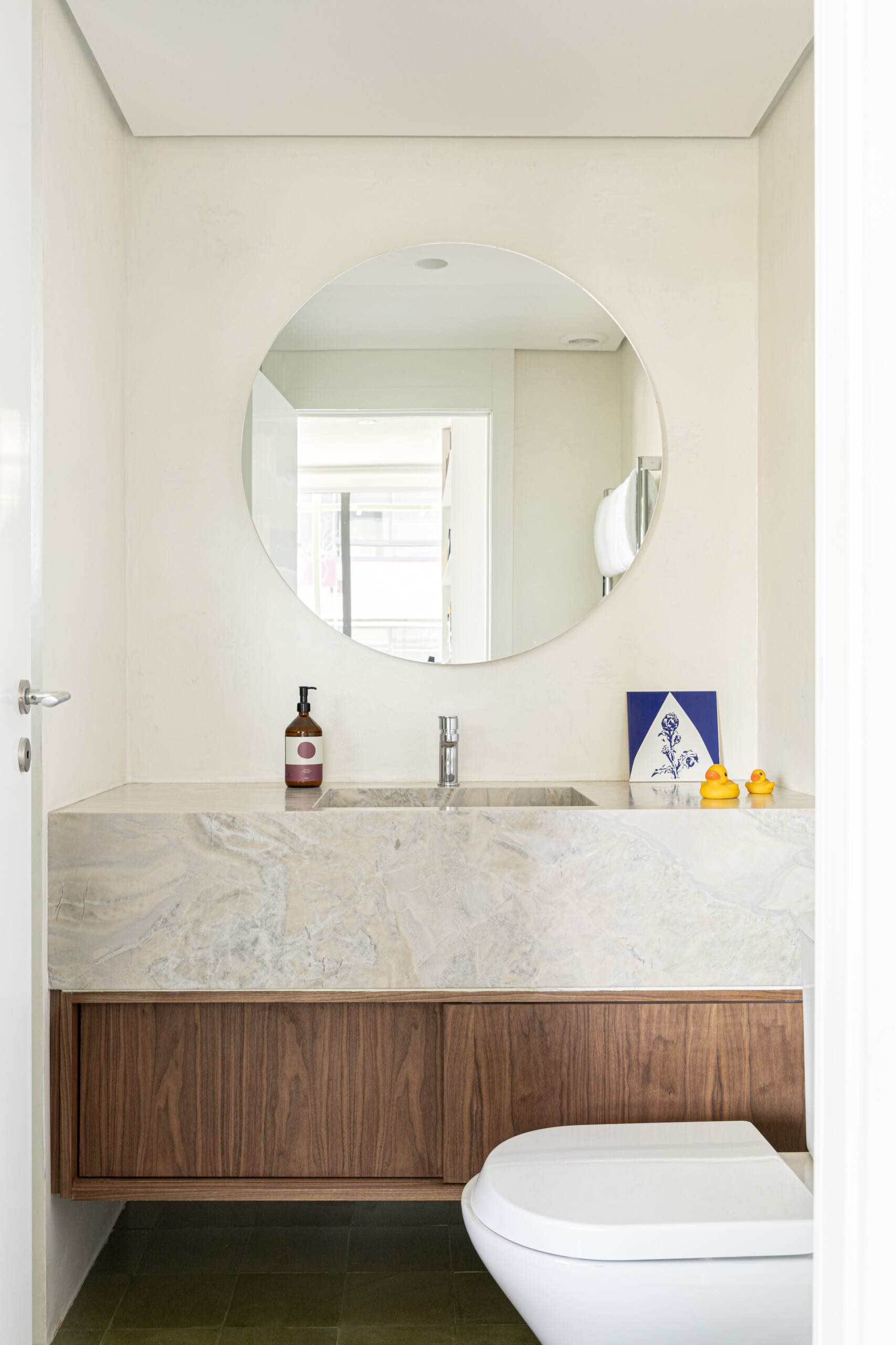 Formas circulares marcam a geometria do apartamento, aparecendo em elementos como o visor do lavabo, espelhos, base da mesa do escritório e apoios do banco em concreto. Essa referência surge, de maneira mais orgânica, no painel de azulejos criado por Helena Leopardi. Em contraponto, linhas retas trazem rigidez e demarcam algumas intenções de projeto, presentes nos elementos de serralheria e no ângulo de abertura formado pelo nicho em alvenaria da geladeira.