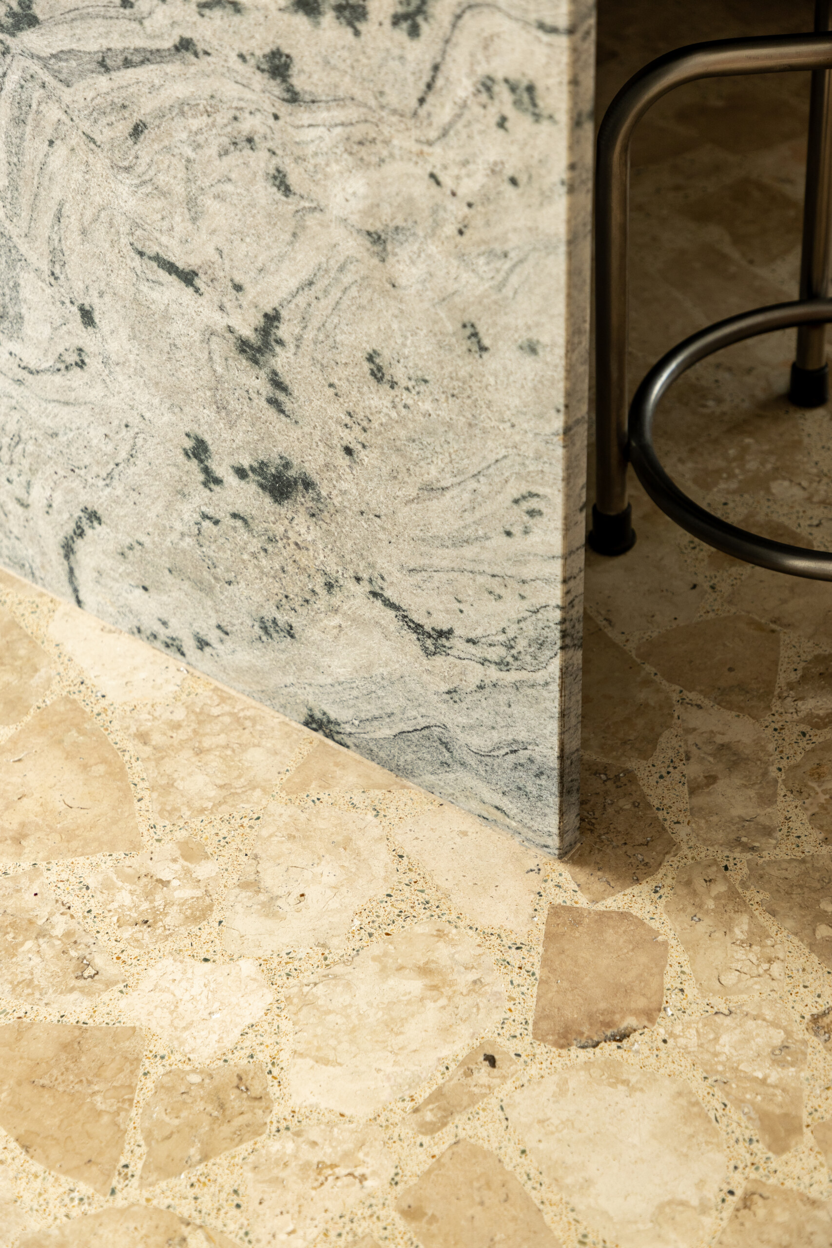 Com a integração desses espaços, um elemento aparece como articulador principal de usos e fluxos, que é a ilha entre a cozinha e a sala de jantar, que se apresenta como um monólito, a partir de um granito natural que se destaca por seus desenhos esculpidos pela própria natureza.