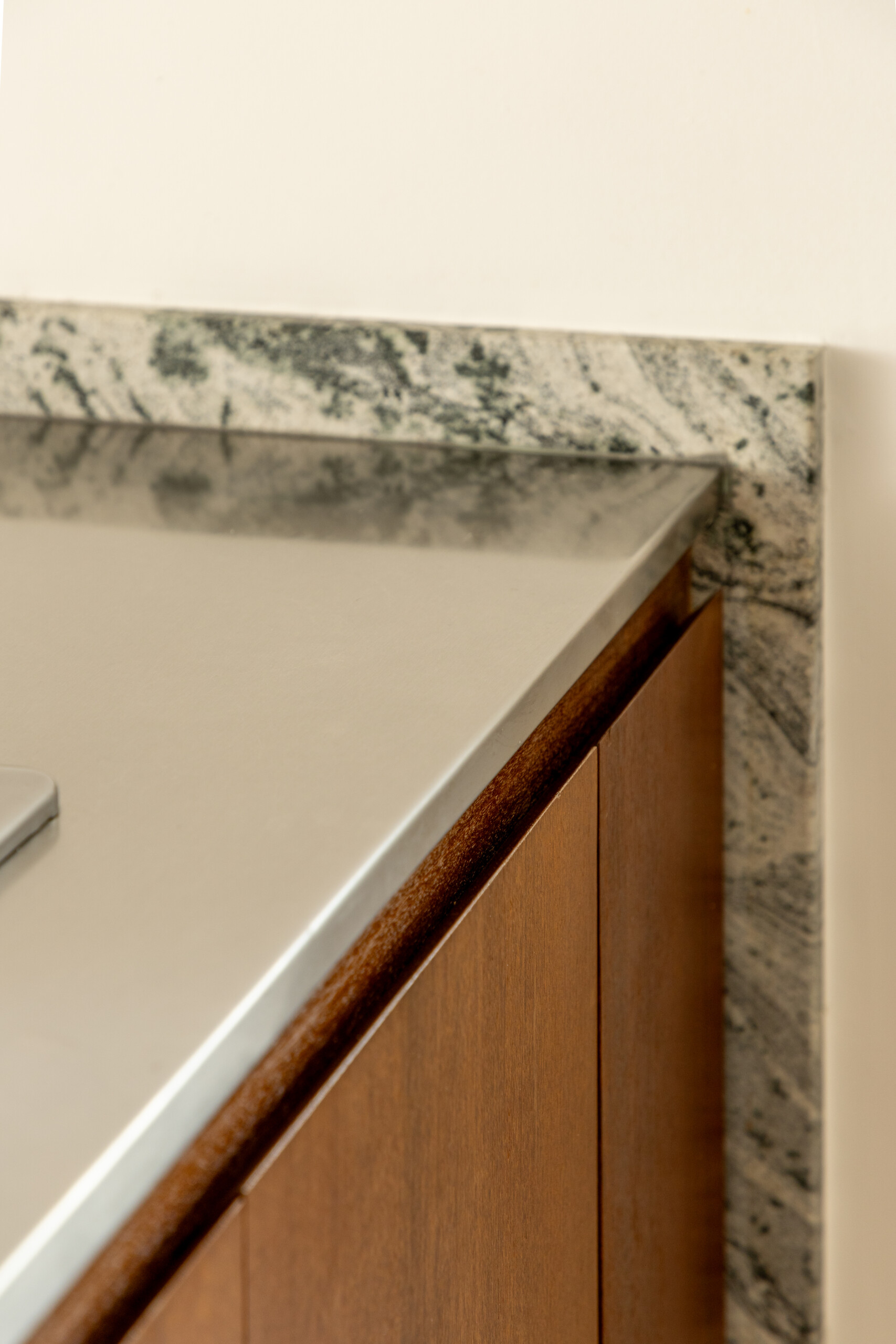 Em meio a esse exercício de dialogar com o tempo, alguns ambientes tiveram suas funções ressignificadas à contemporaneidade, como a cozinha, que antes se apresentava como um espaço de serviço, hoje soma-se à área social de um lar, responsável por promover momentos de união em volta do preparo de refeições. Esse era um ponto muito importante para os novos moradores: uma relação sem barreiras entre sala de estar, sala de jantar e cozinha. Essa demanda trouxe a oportunidade de uma solução que fizesse a transição entre as materialidades já mencionadas, que aparece nas soleiras em aço inox escovado e é replicada em uma das bancadas.