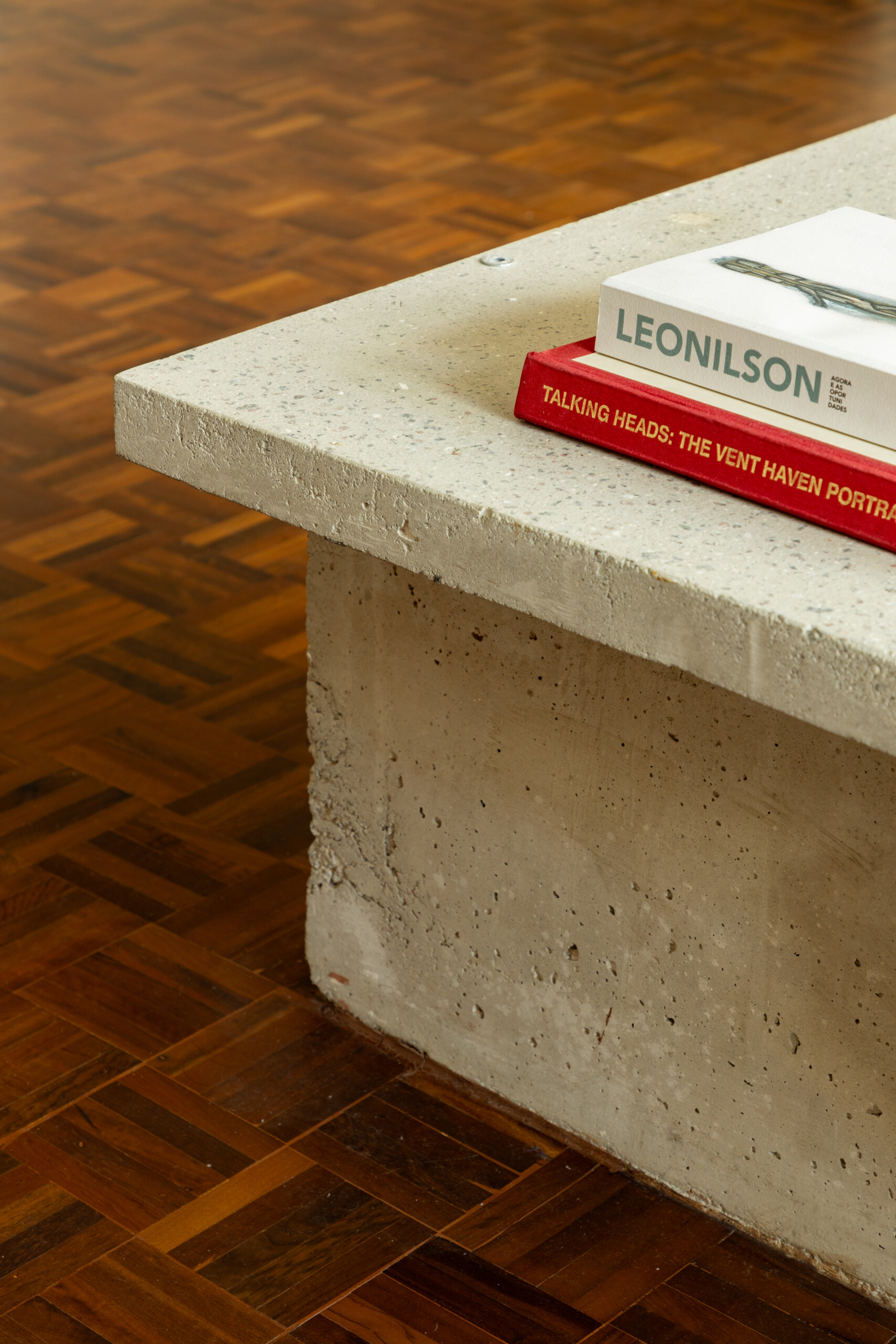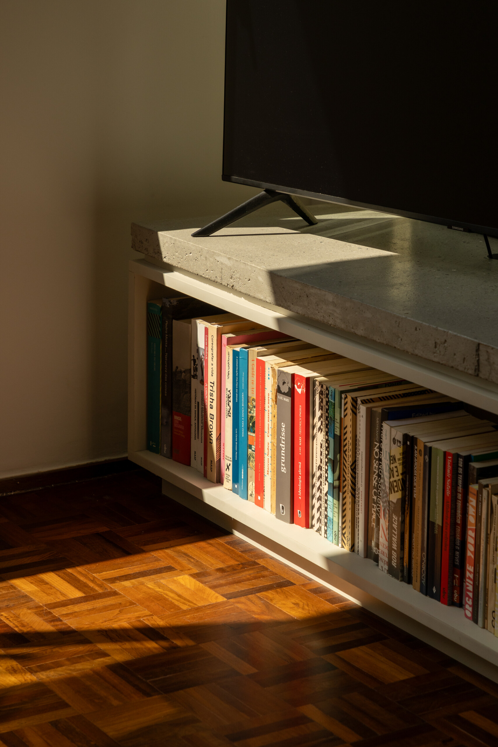 Alguns elementos foram definidos como norte em termos de materialidade desde a primeira visita ao imóvel, junto aos clientes, onde o ponto de partida seria o restauro de superfícies que se mantiveram originais à construção, mas que tiveram o uso e o tempo impressos em sua aparência. A partir desse raciocínio, agregaram-se à essa paleta o marmorite da cozinha, o granilite da área de serviço e o piso de madeira da área social e área íntima, além das estruturas em concreto expostas.