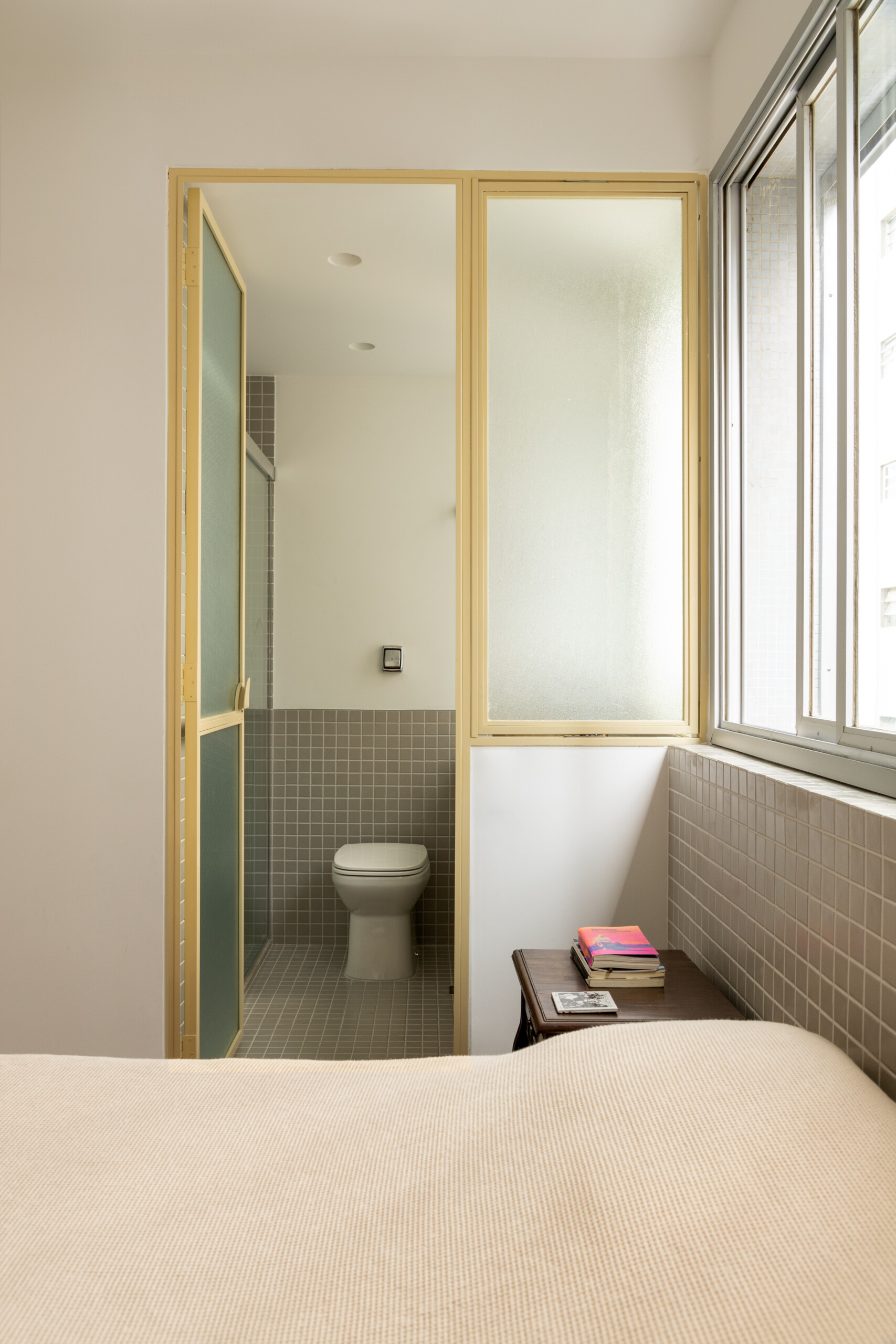 Outro uso contemporâneo que teve um impacto direto na remodelação da planta do apartamento foi a substituição de um dos dormitórios por um escritório, mas esse ambiente deveria ter uma função híbrida que abrigasse um quarto de hóspedes e uma possível extensão da sala de estar. Os elementos responsáveis por essa integração, além de trazer luz e espontaneidade à esse espaço, são as esquadrias em serralheria e vidro, que permitem uma abertura quase total desta sala, que se abre aos demais espaços da área social.