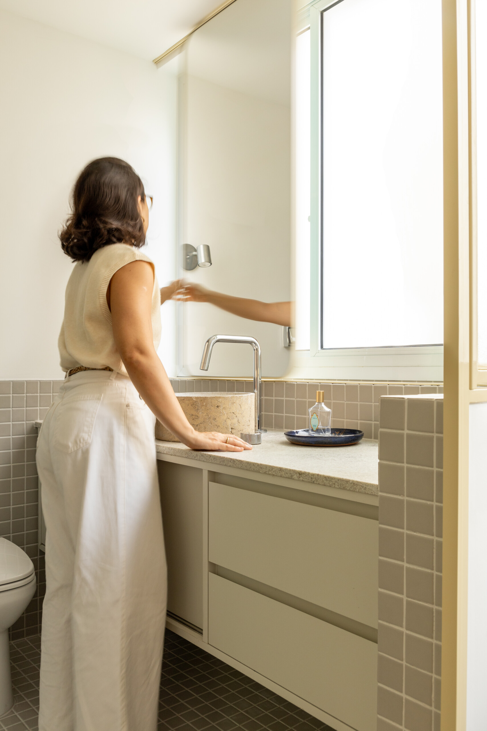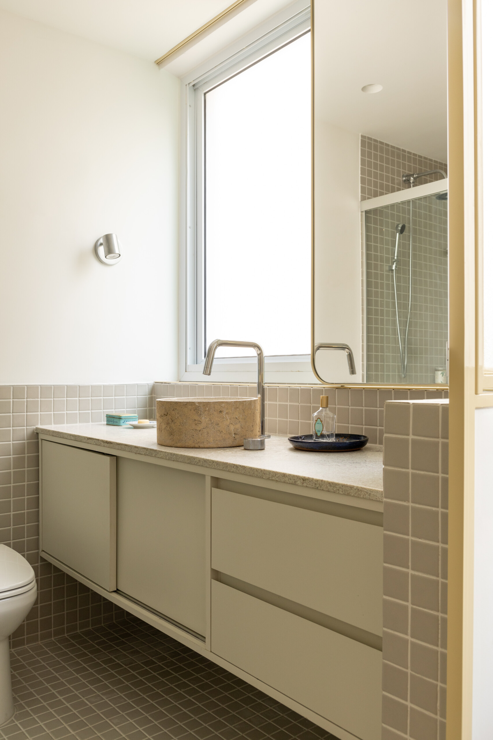 Reformar apartamentos antigos, para quem está aberto a isso, também envolve a descoberta do inusitado. Durante a demolição dos revestimentos dos banheiros, uma nova textura surgiu do assentamento incorreto de cerâmicas, essas já não originais, onde destacaram-se círculos de argamassa, surpresa essa que vimos com bons olhos e mantivemos aparente junto aos novos revestimentos especificados para essa área.